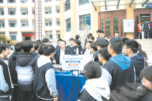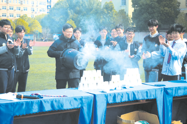 操場上,水火箭拖著尾焰直沖云霄,非牛頓流體在重錘下瞬間固化……這是今年3月份,隨州二中第二屆數理科技游園活動中的一幕。