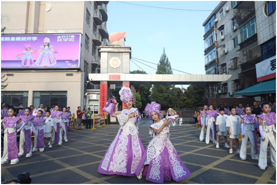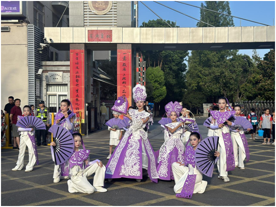 最引人注目的莫過于感恩廣場上的 “非遺迎開學 紙韻童模秀”。學校將非遺剪紙?zhí)厣n程與開學迎新儀式深度融合,師生們親手創(chuàng)作的剪紙作品被巧妙融入服裝 —— 蝴蝶翩躚、樹木蔥郁、森林秘境等圖案躍然衣上,粉粉的紫、柔和的白,身著創(chuàng)意服裝的 “非遺童模” 們邁著活力爽颯的步伐,在音樂中展現獨特創(chuàng)意。這場充滿特色和文化韻味的走秀,既讓同學們感受到非遺文化的魅力,也讓返校時光變得親切又溫暖。
