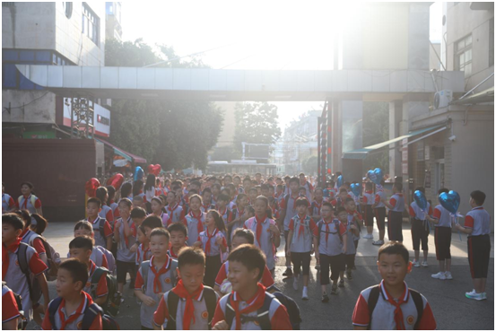大隊委志愿者們手持五彩氣球,主動上前牽起低年級同學的手,耐心引導他們找到教室,一句句 “歡迎回家”“別著急,我?guī)闳ァ?讓校園充滿暖意。