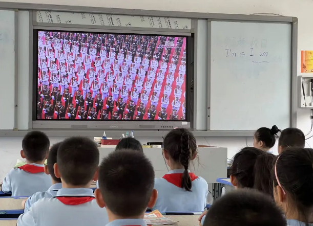 師生們早早地聚集在教室,懷著激動的心情等待閱兵式開始。當(dāng)閱兵方隊邁著整齊的步伐走過天安門廣場,先進的武器裝備一一亮相時,教室里不時傳來陣陣驚嘆聲和掌聲。