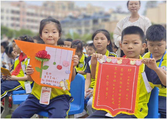 隨后,溫馨感人的“獻(xiàn)禮致敬”環(huán)節(jié)將典禮推向高潮。各班學(xué)生代表向全體老師獻(xiàn)上了精心自制的感恩賀卡。在動人的《感恩的心》旋律中,全體學(xué)生高高舉起手中的感恩之花,瞬間匯成一片絢爛的“花!薄T谝魳防蠋熗跻缓闹笓]下,全校師生齊唱校歌,歌聲嘹亮,情真意切。最后,全體學(xué)生起立,向辛勤耕耘的老師們深深鞠躬,并齊聲高呼:“老師,您辛苦了!謝謝您!”洪亮而整齊的聲音在校園上空回蕩,表達(dá)了孩子們最真摯、最純樸的謝意。