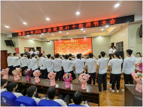 大會(huì)在莊嚴(yán)的國(guó)歌聲中開始,全體教師肅立致敬。學(xué)生代表劉睿益、耿沛然向老師獻(xiàn)詞,表達(dá)感恩之情。28名新入職青年教師集體宣誓,承諾忠誠(chéng)教育事業(yè),新教師代表李滄作表態(tài)發(fā)言。