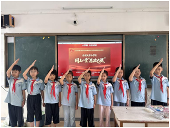 課程最后,當(dāng)畫面定格于英雄堅毅的面龐,全體隊員自發(fā)肅立,整理紅領(lǐng)巾,高舉右手,向先烈致以最莊嚴(yán)的隊禮。這一刻,無聲的緬懷與繼承遺志的堅定決心在教室久久回蕩。