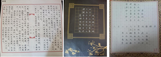 五六年級以“寫規(guī)范字”為核心,開展“普通話+規(guī)范字”書法作品提交活動(dòng)。學(xué)生們圍繞“推廣普通話”“我愛中國話”等主題,書寫古詩、名篇。作品中,每個(gè)漢字筆畫工整、結(jié)構(gòu)勻稱,既展現(xiàn)了學(xué)生扎實(shí)的書寫功底,又傳遞了“說好普通話、寫好規(guī)范字”的理念。