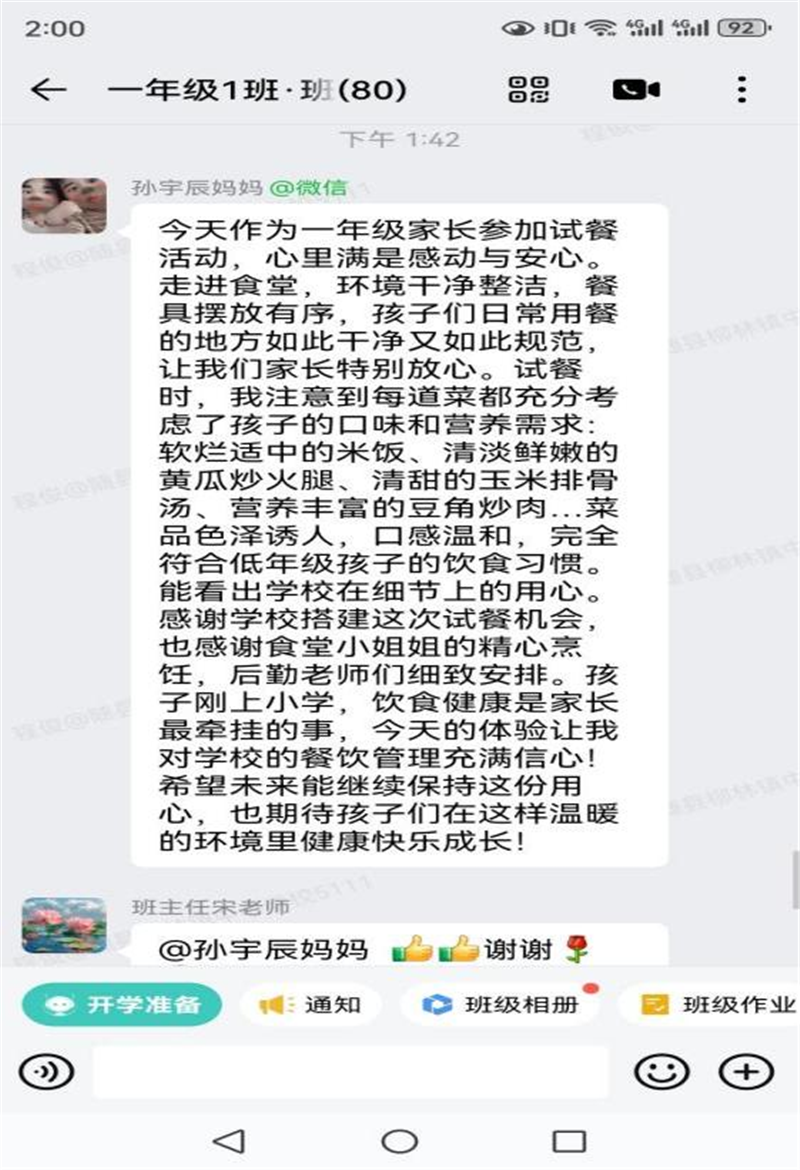 在學(xué)校食堂,家長們代表依次查看了供應(yīng)商信息和原材料采購價格公示,并深入儲藏間、操作間等區(qū)域進行查看。隨后,學(xué)校領(lǐng)導(dǎo)和家長代表們共同進餐,讓家長更直觀的了解學(xué)生日常用餐情況。餐后家長們填寫了評餐記錄。一年級家長代表孫宇辰媽媽:“今天作為一年級家長參加試餐活動,心里滿是感動與安心。走進食堂,環(huán)境干凈整潔,餐具擺放有序,孩子們?nèi)粘S貌偷牡胤饺绱烁蓛粲秩绱艘?guī)范,讓我們家長特別放心。試餐時,我注意到每道菜都充分考慮了孩子的口味和營養(yǎng)需求:軟爛適中的米飯、清淡鮮嫩的黃瓜炒火腿、清甜的玉米排骨湯、營養(yǎng)豐富的豆角炒肉…菜品色澤誘人,口感溫和,完全符合低年級孩子的飲食習(xí)慣。能看出學(xué)校在細節(jié)上的用心。感謝學(xué)校搭建這次試餐機會,也感謝食堂廚師的精心烹飪和后勤老師們細致安排。孩子剛上小學(xué),飲食健康是家長最牽掛的事,今天的體驗讓我對學(xué)校的餐飲管理充滿信心!希望未來能繼續(xù)保持這份用心,也期待孩子們在這樣溫暖的環(huán)境里健康快樂成長!”