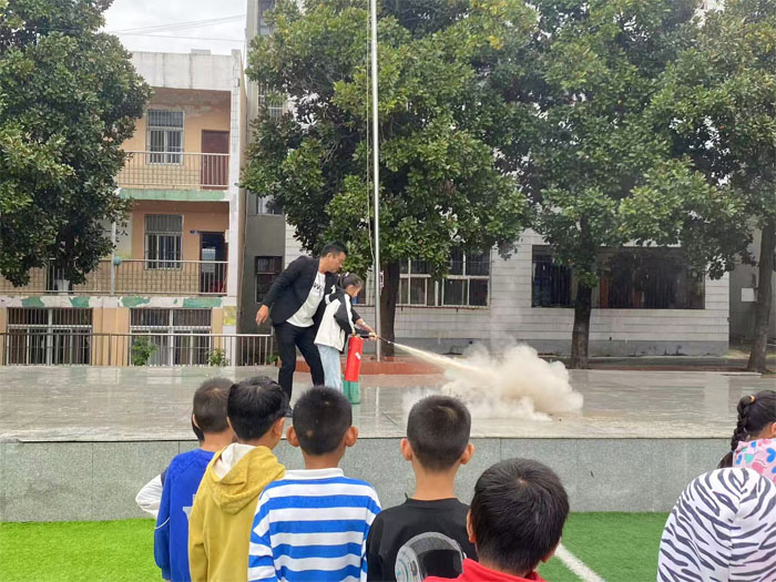 隨著消防警報(bào)聲響起,各班學(xué)生迅速用手捂住口鼻,在教師引導(dǎo)下彎腰低姿、沿著預(yù)定路線有序撤離。樓道內(nèi),引導(dǎo)教師時(shí)刻提醒學(xué)生注意腳下安全,避免滑倒。在滅火器實(shí)操環(huán)節(jié),章校長(zhǎng)細(xì)致講解滅火器的使用步驟,并現(xiàn)場(chǎng)演示撲滅模擬火源。在老師的鼓勵(lì)下,多名學(xué)生踴躍上臺(tái)嘗試。他們按照“一提、二拔、三握、四壓”的要領(lǐng),成功撲滅燃燒物。盡管雨水打濕了臉龐,學(xué)生們學(xué)習(xí)消防技能的熱情卻絲毫不減。