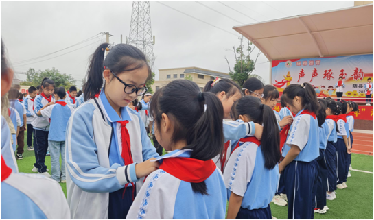儀式在激昂的出旗曲中拉開(kāi)序幕,全體少先隊(duì)員肅立敬禮,目光追隨著隊(duì)旗,齊聲高唱《中國(guó)少年先鋒隊(duì)隊(duì)歌》,稚嫩而堅(jiān)定的歌聲里,紅領(lǐng)巾與信仰一同飛揚(yáng)。大隊(duì)輔導(dǎo)員黃楠子宣讀新隊(duì)員名單后,老隊(duì)員代表為新隊(duì)員鄭重佩戴紅領(lǐng)巾,新隊(duì)員們高舉右拳莊嚴(yán)宣誓,錚錚誓言響徹校園,既是對(duì)少先隊(duì)組織的鄭重承諾,也是邁向成長(zhǎng)的堅(jiān)定步伐。