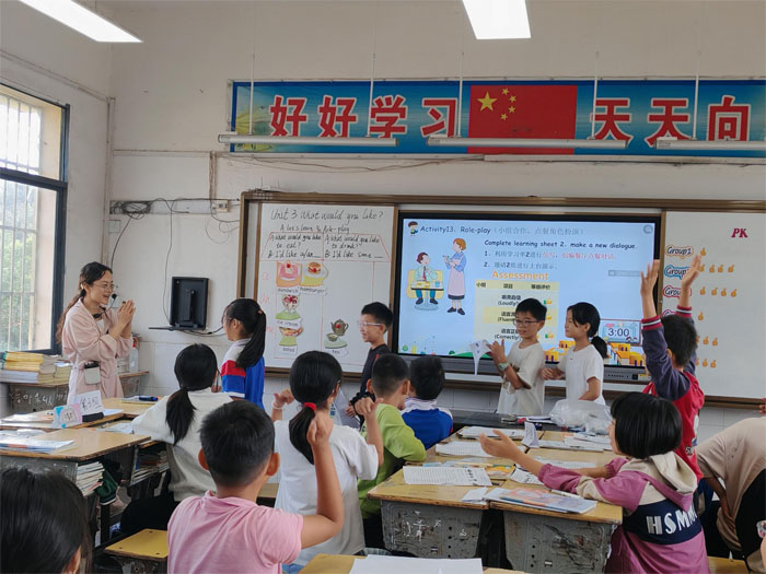 接著,柳林鎮(zhèn)第一小學(xué)劉丹老師與第二小學(xué)宋慧惠老師聚焦人教版四年級上冊《Unit 1 Helping at home Part B Let's talk》,演繹出風(fēng)格迥異的“同課同構(gòu)”課堂教學(xué)。劉老師以“問題鏈”為課堂主線,緊扣“家務(wù)勞動”主題,構(gòu)建起“情境導(dǎo)入—新知探究—語言運用—拓展延伸”的遞進式問題體系,讓對話教學(xué)從“碎片化問答”走向“結(jié)構(gòu)化思維”。宋老師則以生活化問題為切入口,迅速激活學(xué)生已有經(jīng)驗;新知探究環(huán)節(jié),設(shè)計“What can you do ?Can you cook?”等基礎(chǔ)性問題,引導(dǎo)學(xué)生聚焦對話核心句型;拓展延伸環(huán)節(jié),以“What can you do for your family?How can you help your family?How do you feel?”為開放性問題,鼓勵學(xué)生小組合作、踴躍表達,讓語言學(xué)習(xí)與生活實踐深度融合。