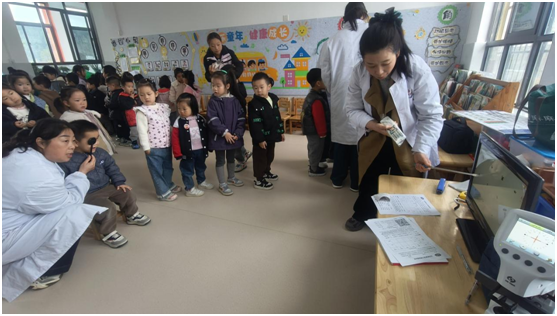 活動(dòng)現(xiàn)場(chǎng),在老師的有序引導(dǎo)下,孩子們排著整齊的隊(duì)伍,依次配合檢測(cè)。醫(yī)護(hù)人員熟練操作專(zhuān)業(yè)設(shè)備,細(xì)致為每一位幼兒檢查視力,同時(shí)用淺顯易懂的語(yǔ)言講解護(hù)眼小知識(shí):“看電視要離遠(yuǎn)一點(diǎn),每天要多看看窗外的綠樹(shù)哦!”溫柔的互動(dòng)不僅緩解了孩子的緊張感,更讓護(hù)眼意識(shí)悄悄扎根。