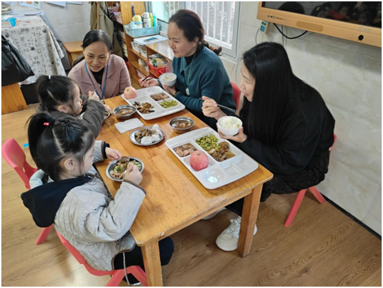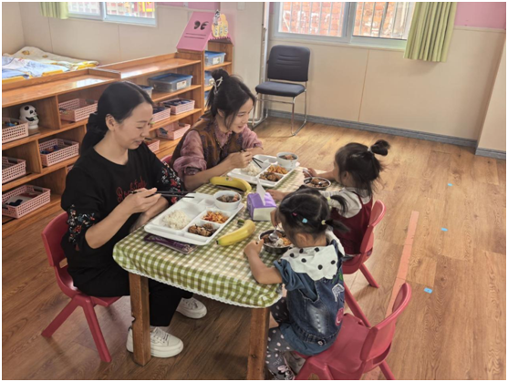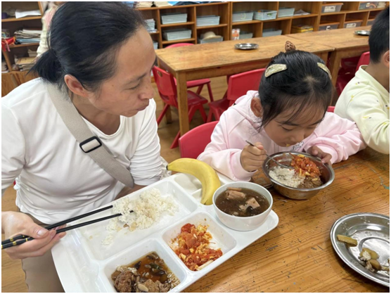 最溫馨的環(huán)節(jié)當屬“親子共進午餐”。幼兒園的膳食兼顧“營養(yǎng)與美味雙在線”:排骨燉蓮藕軟糯香甜,蓮藕吸飽肉香;紅燒獅子頭色澤紅亮,肉質緊實;西紅柿炒雞蛋酸甜適口,火候精妙。家長們圍坐孩子身旁,看著小家伙們大口進食,也忍不住品嘗,在反饋表上留言:“口味清淡鮮香,特別適合孩子”“分量足、溫度適宜,幼兒園太用心了”。