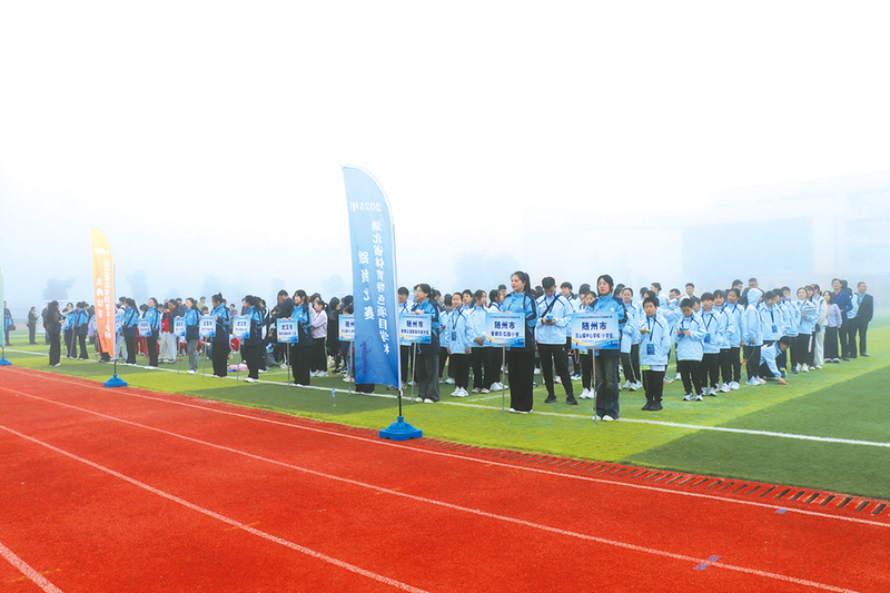 賽事啟幕當(dāng)日,隨州被一層薄霧輕籠,而曾都區(qū)編鐘小學(xué)門前早已熱鬧非凡。一支由曾都區(qū)白云湖小學(xué)57名學(xué)生組成的鼓號隊,身著整齊制服,昂首挺胸奏響《出旗曲》《退旗曲》。鼓點鏗鏘穿越薄霧,號聲嘹亮劃破晨空,稚嫩的臉龐上滿是認(rèn)真,用最熱情的姿態(tài)迎接來自湖北省四面八方的參賽師生。一旁的迎賓舉牌隊伍里,“仙桃市第二小學(xué)”“麻城市第六小學(xué)”“武漢市青山區(qū)鋼花小學(xué)”等校名格外醒目,成為連接各地校園體育力量的生動紐帶。