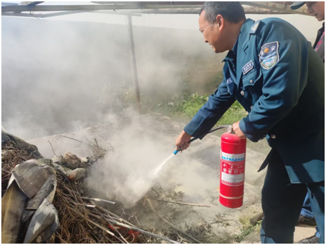 疏散環(huán)節(jié)結束后,活動進入實戰(zhàn)體驗階段。幼兒園安保老師化身為“安全教練”,現(xiàn)場演示了滅火器的正確使用方法,并詳細講解了“提、拔、握、壓”四字操作口訣。在模擬火源前,老師手持滅火器,果斷按下壓把,白色干粉迅速覆蓋火點,成功將“火情”撲滅,生動直觀的演示贏得了孩子們的陣陣掌聲。