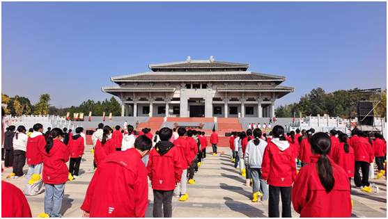 在景區(qū)內(nèi),講解員引領(lǐng)學(xué)生依次參觀文化雕塑壁、四生耕作石雕、華夏始祖門、圣火臺等標(biāo)志性景觀,生動講述炎帝嘗百草、教農(nóng)耕的歷史典故,讓學(xué)生直觀感受華夏文明的悠久傳承。10:00,圣像廣場前舉行了莊重的愛國主義宣誓儀式,學(xué)生們高舉右拳、聲音洪亮,將愛國情懷融入內(nèi)心;隨后的有獎問答環(huán)節(jié),更激發(fā)了大家主動思考的積極性,現(xiàn)場氛圍熱烈。11:00,全體師生參與“拜祖大典”,在肅穆的儀式中致敬始祖、傳承文化;大典結(jié)束后,師生共同拍攝合影以定格珍貴瞬間,并集體參觀炎帝神農(nóng)大殿,進(jìn)一步加深對炎帝文化的理解。