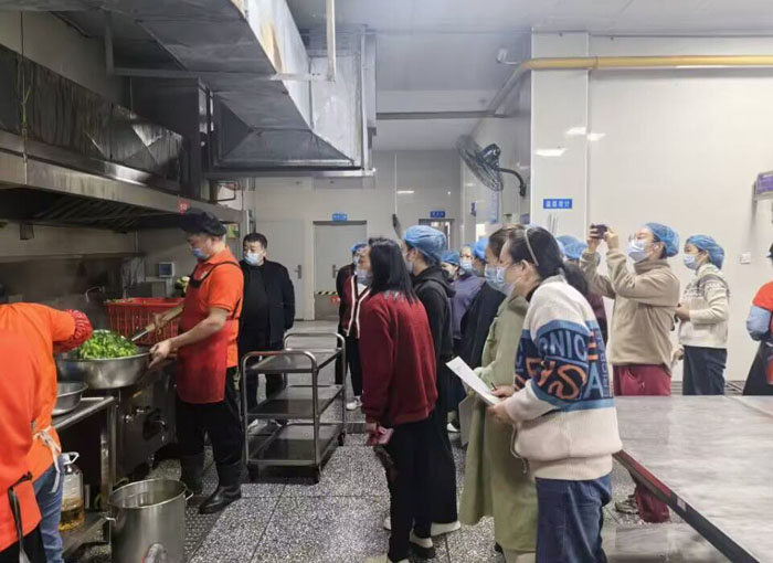 在烹飪區(qū),廚師們正有條不紊地忙碌著,新鮮的食材經(jīng)過清洗、切配后,被做成一道道營養(yǎng)均衡的菜肴。家長代表們現(xiàn)場觀摩了菜品的制作過程,從食材處理的衛(wèi)生規(guī)范到烹飪時的火候把控,從調(diào)味料的適量添加到菜品的留樣保存,每一個細(xì)節(jié)都彰顯著食堂對食品安全和營養(yǎng)搭配的重視!霸瓉砗⒆用刻斐缘牟耸沁@樣做出來的,清洗得這么干凈,烹飪過程也很規(guī)范,我們太放心了!” 一位家長一邊觀看一邊感慨。