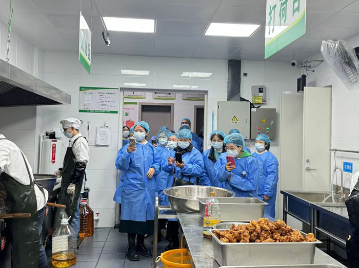 在何玉霞主任的引導(dǎo)下,家長代表們統(tǒng)一換上一次性凈化服,循著"食材倉庫→粗加工間→烹飪間→配餐區(qū)→學(xué)生就餐區(qū)"的專屬路線,沉浸式探訪食堂運(yùn)作全鏈條。大家邊走邊看、邊問邊記,重點(diǎn)核查食材新鮮度、儲(chǔ)存環(huán)境是否達(dá)標(biāo)、消毒設(shè)備是否規(guī)范運(yùn)行等細(xì)節(jié),從源頭到餐桌,每一個(gè)環(huán)節(jié)都仔細(xì)把關(guān),讓"舌尖上的校園"真正經(jīng)得起檢驗(yàn)。