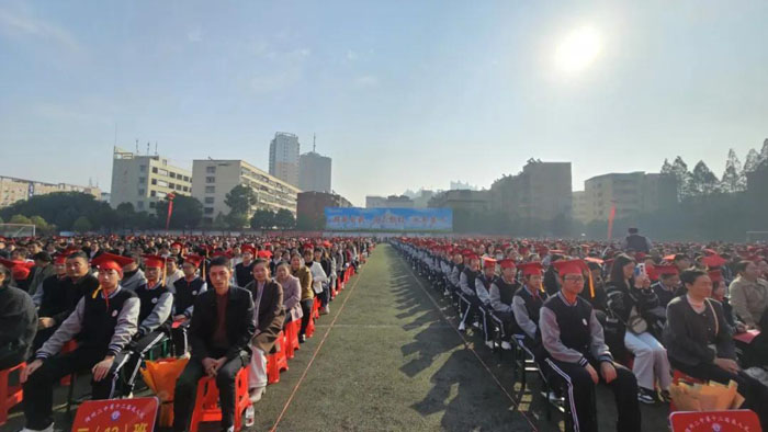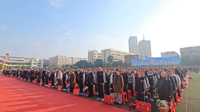 上午9時,伴隨國歌奏響,鮮艷的五星紅旗在師生與家長的注目禮中冉冉升起。在全場矚目中,學(xué)校黨委副書記、校長肖繁榮在致辭中勉勵同學(xué)們懷揣感恩之心,理解父母的付出;扛起責(zé)任之擔(dān),珍惜時代賦予的機遇;點燃奮斗之火,在高考戰(zhàn)場上書寫無悔青春;不負(fù)夢想之光,讓人生在拼搏中閃耀。