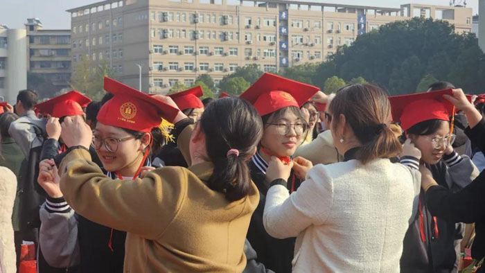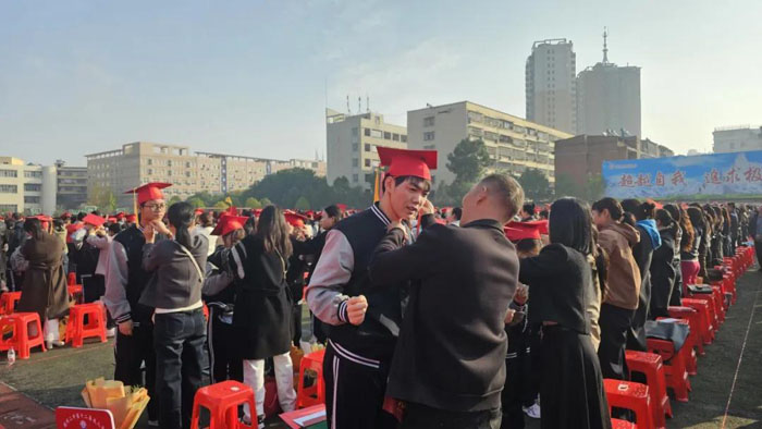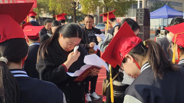 成人儀式環(huán)節(jié)上,家長鄭重地為學(xué)生佩戴成人帽。學(xué)生們深深鞠躬,以最莊重的禮儀表達(dá)對父母的感恩。家長寫給孩子的寄語、孩子寫給父母的心聲,在此刻交換。 隨后,各班整齊列隊,邁著矯健的步伐依次跑步穿過“成人門”。家長代表、教師代表、學(xué)生代表先后上臺發(fā)言。同學(xué)們向班主任獻(xiàn)花,感謝他們長久以來的陪伴與傾心教導(dǎo)。高三學(xué)子鄭重宣誓,一句句鏗鏘有力的誓詞,在操場上回蕩。