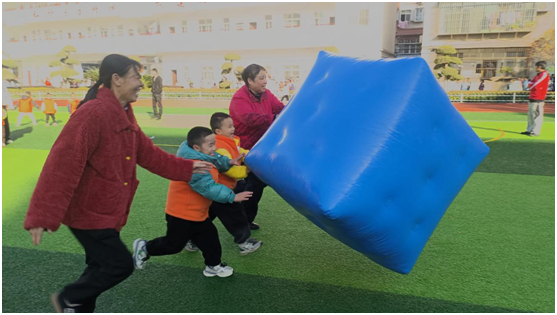 “運輸炸藥”環(huán)節(jié)中,家長與孩子通力協(xié)作,小心翼翼地將“正方體炸藥”運往目的地,“導(dǎo)彈發(fā)射”比賽中,“小兵”們背起“小火箭”勇往直前,家長緊隨其后,成為孩子最堅實的后盾;“全速前進”時,孩子們趴在“軍毯”上,由家長奮力牽引,現(xiàn)場加油聲、歡笑聲此起彼伏。