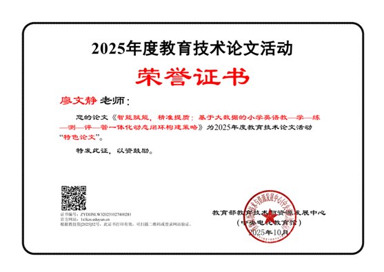 隨州新聞網(wǎng)訊 (通訊員鄧志娟、賈曉燕)11月底,2025年度全國教育技術論文評選活動結果正式出爐,在曾都區(qū)獲評的6名教師中,五眼橋小學有2位教師榜上有名。其中,廖文靜老師的論文《智能賦能,精準提質:基于大數(shù)據(jù)的小學英語教學動態(tài)閉環(huán)構建策略》獲評“特色論文”,梁紅老師的《依托數(shù)據(jù)循證促進師生發(fā)展》則榮獲“入圍論文”獎。