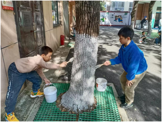 學(xué)校工作人員按照比例配制好石灰溶液并攪拌均勻,以利刷勻。為高年級的同學(xué)們分發(fā)了石灰、刷子以及水桶等相關(guān)用品,并進(jìn)行了合理分工;顒(dòng)中,在相關(guān)人員的指導(dǎo)下,師生手拿工具,嚴(yán)格按照樹木刷白的流程和標(biāo)準(zhǔn),依次對操場等區(qū)域的樹木進(jìn)行刷白。