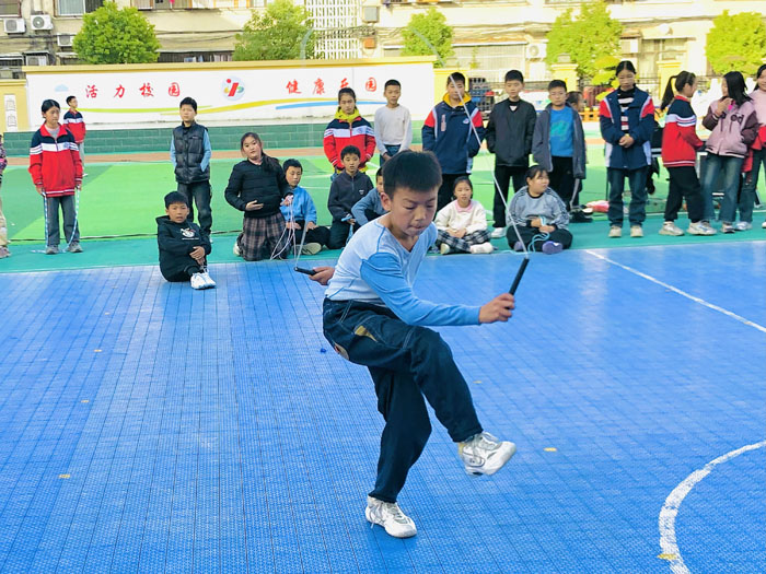 賽場(chǎng)上,小運(yùn)動(dòng)員們繩影翻飛、身姿矯健。單人項(xiàng)目中,他們比拼速度與技巧,不斷突破自我;集體項(xiàng)目里,大家默契配合、步調(diào)一致,展現(xiàn)超強(qiáng)凝聚力。場(chǎng)外加油聲此起彼伏,校園洋溢著歡樂(lè)競(jìng)技氛圍。
