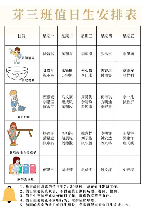 值日工作被細(xì)化為“晨間消毒”“餐具準(zhǔn)備”“餐后整理”“掃地拖地”“垃圾歸類(lèi)”等五個(gè)小崗位,每個(gè)孩子都有屬于自己的“清潔使命”。早晨,消毒小能手認(rèn)真擦拭每一張桌面;餐前,餐具組的小朋友把碗勺擺放得整整齊齊;餐后,清掃小隊(duì)迅速出動(dòng),清理飯粒、擦拭桌椅;放學(xué)時(shí),垃圾小管家還會(huì)仔細(xì)檢查分類(lèi)情況。安排表上特別用加粗字體標(biāo)出每日組長(zhǎng),帶動(dòng)小伙伴一起完成任務(wù),小小的分工里,藏著大大的責(zé)任感。
