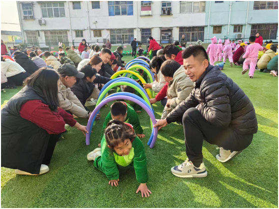 親子互動環(huán)節(jié)暖意融融。“大手牽小手,共翻浪浪山”游戲中,家長與孩子默契配合,完成“泡沫棒傳遞”、“趣味扔沙包”等項目。大手握小手的身影滿是溫情,孩子們在奔跑中釋放活力,在協(xié)作中學會分享,笑臉成為冬日里的動人風景。