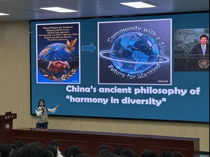 決賽現(xiàn)場,高手云集,亮點紛呈。而其中,來自高二20班的龐明一和胡藝凡同學(xué),以其獨具匠心的選題和沉著自信的臺風(fēng),成為了全場最矚目的焦點。龐明一:《Chinese Mortis and Tenon》(中國榫卯的文化魅力)。胡藝凡:《China'sancient philosophy of “harmony in diversity”》(中國“和而不同”的外交哲理)
