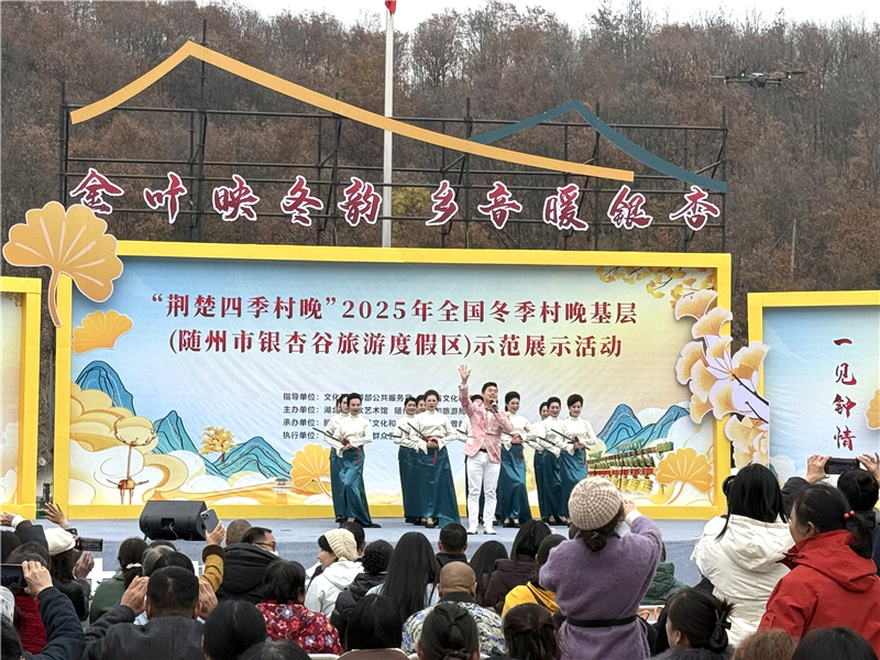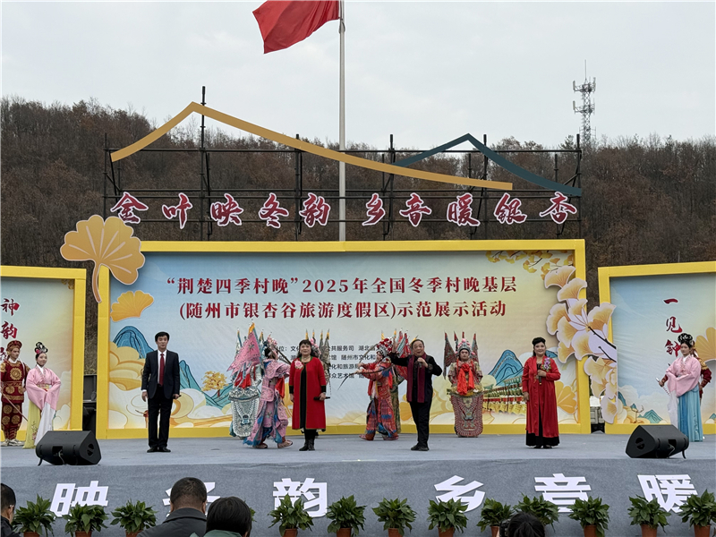 冬日的曾都區(qū)洛陽鎮(zhèn),連綿的銀杏林褪去金黃,枝干遒勁地指向天空。在九口堰新四軍第五師革命舊址紀(jì)念館門前廣場(chǎng)上,鑼鼓鏗鏘,絲竹悠揚(yáng),舞姿翩躚。12月4日,“荊楚四季村晚”2025全國(guó)冬季村晚基層(隨州市銀杏谷旅游度假區(qū))示范展示活動(dòng)在這里開演,為冬日鄉(xiāng)村帶來了一抹亮麗的文化暖色。 “咱隨州的好山水,唱也唱不完……”4位花鼓戲“非遺”傳承人帶來的花鼓戲表演唱《魅力隨州我的家》一開嗓,地道的方言俚語、婉轉(zhuǎn)的花鼓調(diào)子,瞬間點(diǎn)燃了現(xiàn)場(chǎng)。這項(xiàng)國(guó)家級(jí)“非遺”,唱的是眼前的山水,道的是心底的鄉(xiāng)情!奥牭锰H切了!這就是我們從小聽到大的調(diào)子!迸_(tái)下不少老人跟著曲調(diào)輕輕哼唱。 一抹熾熱的“中國(guó)紅”點(diǎn)亮了舞臺(tái)。曾都區(qū)廣場(chǎng)舞協(xié)會(huì)帶來的舞蹈《紅滿天》,舞出了百姓心中的喜悅與豪情。本土情懷是村晚最動(dòng)人的底色。隨州籍歌手楊學(xué)超唱響《千年銀杏谷》,唱出了古銀杏的滄桑與隨州的人文風(fēng)情。在銀杏谷經(jīng)營(yíng)民宿的張文強(qiáng)一邊用手機(jī)錄像,一邊感慨:“就像歌里唱的,我們這兒的山水就是有魅力,作為一個(gè)洛陽人,心里特別驕傲。希望這樣的‘村晚’常來,我們老百姓的文化生活就更豐富了! “非遺”的薪火,在掌聲中傳遞。隨縣唐縣鎮(zhèn)中心學(xué)校的孩子們扮上戲裝,表演起“隨縣三獨(dú)”。省群藝館的演員帶來了湖北大鼓《擼起袖子加油干》,唱詞樸實(shí)如拉家常,節(jié)奏明快似擂戰(zhàn)鼓,每一句落下都激起一片叫好聲。 當(dāng)深沉恢弘的編鐘樂聲通過音響流淌開來,時(shí)空仿佛被悄然置換。湖北省三鼎藝術(shù)團(tuán)的舞者身著楚風(fēng)長(zhǎng)裙,在《楚韻芳華》的樂章中款款起舞。廣水市楚劇團(tuán)的經(jīng)典片段《站花墻·摘花》則把老戲迷們帶入了另一個(gè)世界。 魔術(shù)《鴿劇魅影》引得驚呼連連,男女聲對(duì)唱《幸福中國(guó)一起走》旋律激昂……節(jié)目形式多樣,內(nèi)容貼近生活,現(xiàn)場(chǎng)掌聲、喝彩聲不斷。 這場(chǎng)在千年銀杏谷上演的冬季“村晚”,用百姓喜聞樂見的方式,將舞臺(tái)搭到村頭,將歡樂送到心頭,生動(dòng)詮釋了“文藝點(diǎn)亮生活”的內(nèi)涵。