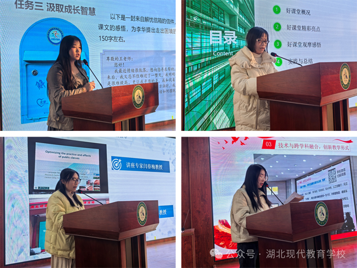 在分享交流環(huán)節(jié),學(xué)校優(yōu)秀教師代表結(jié)合“湖北好課堂”觀摩學(xué)習(xí)成果,帶來了接地氣、有深度的感悟分享。從毛瓔櫻老師對(duì)育人本質(zhì)與創(chuàng)意活動(dòng)融合的探索,到劉艷平老師對(duì)優(yōu)質(zhì)數(shù)學(xué)課共通密碼的深刻剖析;從楊珅麗老師關(guān)于AI賦能與課程育人價(jià)值的啟示,到王彬老師讓思政課“活”起來的實(shí)踐智慧——我們既看到了技術(shù)為教學(xué)帶來的新可能,更感受到了每一位老師對(duì)“教育何以育人”這一根本問題的持續(xù)追問與生動(dòng)回答。