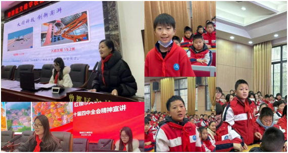 宣講環(huán)節(jié)中,三位老師結(jié)合黨的二十屆四中全會(huì)核心要義與少先隊(duì)員認(rèn)知特點(diǎn),量身定制宣講內(nèi)容,讓抽象理論變得生動(dòng)可感。沈俊俊校長(zhǎng)以《在奮斗中,美好的愿望接連實(shí)現(xiàn)》為題,從個(gè)人小愿望與國(guó)家大發(fā)展的關(guān)聯(lián)切入,闡釋 “奮斗是實(shí)現(xiàn)一切愿望的根本路徑”,勉勵(lì)隊(duì)員們以腳踏實(shí)地的努力積攢成長(zhǎng)力量;孫攀老師聚焦全會(huì)科技創(chuàng)新部署,在《從一騎紅塵到萬(wàn)物互聯(lián)》的宣講中,通過(guò)古今生活場(chǎng)景對(duì)比,直觀展現(xiàn)我國(guó)科技跨越式發(fā)展成果,激發(fā)隊(duì)員 “科技報(bào)國(guó)” 志向;張孜涵老師以《青春筑夢(mèng),強(qiáng)國(guó)有我》為主題,結(jié)合少年英雄事跡與榜樣案例,解讀 “培養(yǎng)擔(dān)當(dāng)民族復(fù)興大任的時(shí)代新人” 的深刻內(nèi)涵,引導(dǎo)隊(duì)員將個(gè)人成長(zhǎng)融入民族復(fù)興征程。宣講結(jié)束后的互動(dòng)環(huán)節(jié),少先隊(duì)員們圍繞奮斗精神踐行、科技創(chuàng)新參與、紅色基因傳承等問(wèn)題踴躍提問(wèn),三位老師的耐心解答進(jìn)一步深化了隊(duì)員們的理解感悟,現(xiàn)場(chǎng)氛圍熱烈融洽。