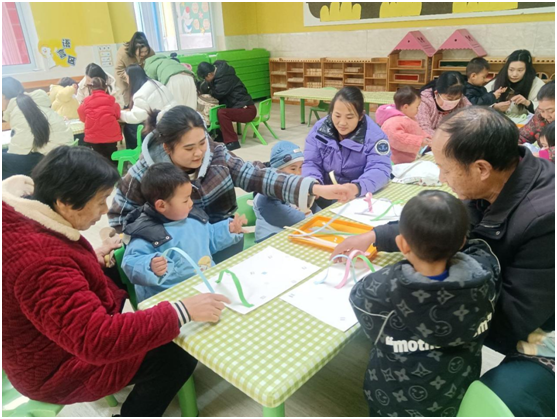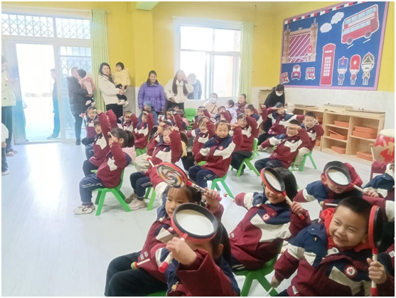 活動伊始,曹夢嬌老師帶領(lǐng)大家參觀圖書室、編鐘教室、皮影戲體驗室、編織手工坊等功能空間,簡潔講解讓親子家庭快速熟悉園所環(huán)境。邵海云老師和大一班幼兒表演了樂器演奏,悠揚(yáng)的樂聲贏得陣陣贊嘆,讓家長和孩子直觀感受傳統(tǒng)文化育人氛圍。