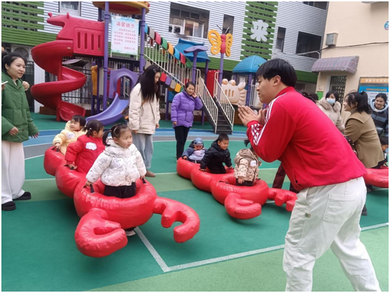 隨后,趣味互動環(huán)節(jié)亮點(diǎn)紛呈:李隨旋老師伴著旋律引導(dǎo)孩子問好破冰;科學(xué)實驗中,萌娃在家長協(xié)助下見證“小河豚”變身的神奇,滿臉驚喜;手工游戲里,卓怡婷老師帶領(lǐng)孩子完成色彩配對粘貼,在動手中收獲樂趣。休整后,皮卡丘老師帶領(lǐng)孩子們走進(jìn)戶外,開展“螃蟹夾”“平衡木氣墊挑戰(zhàn)”等趣味游戲,歡聲笑語彌漫校園。