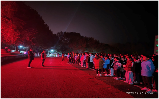本次演練嚴格按照學校制定的夜間消防疏散演練預案和方案有序推進。演練信號發(fā)出后,全校教職工迅速到崗,履行引導疏散職責。教學樓內(nèi)的八、九年級學生,以及宿舍樓內(nèi)的六、七年級學生,在演練疏散引導組人員的指揮下,彎腰低姿、捂住口鼻,沿著預定疏散路線快速、有序地向運動場安全區(qū)域撤離。整個演練過程用時2分36秒,疏散時緊張而不慌亂,師生們動作規(guī)范、配合默契,高效完成了撤離集結(jié)任務。