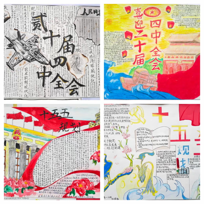 政治組教師結(jié)合課堂教學(xué),對二十屆四中全會精神的核心要義及“十五五”時期國家發(fā)展的方向與重點進行了深入淺出的講解,為學(xué)生創(chuàng)作提供了扎實的理論基礎(chǔ)與思想引導(dǎo)。同學(xué)們利用課余時間,認真搜集資料,精心構(gòu)思布局,將所學(xué)所思與藝術(shù)創(chuàng)意相結(jié)合,創(chuàng)作出了一幅幅主題鮮明、圖文并茂的手抄報作品。