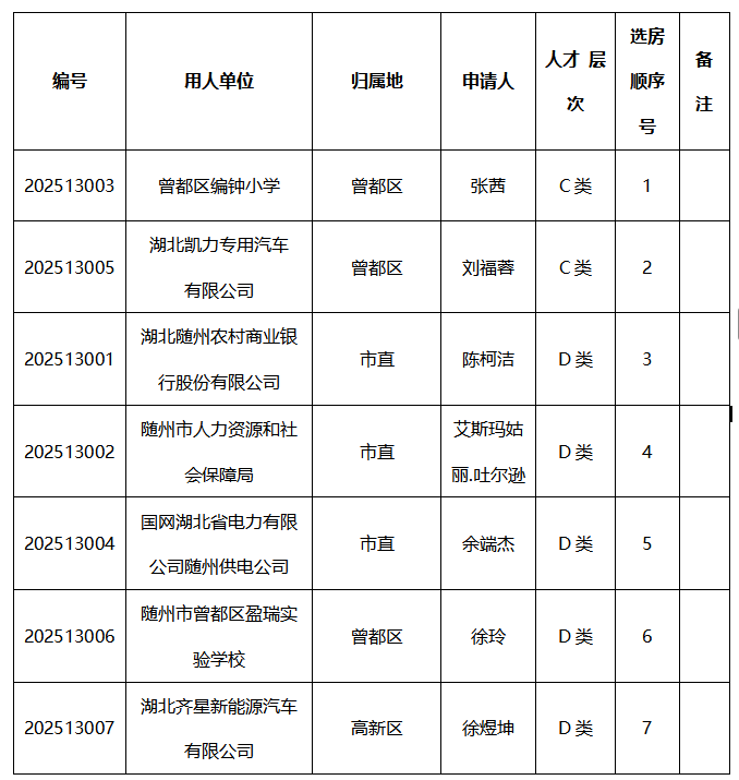 根據(jù)《隨州市人才公寓管理辦法(試行)》相關(guān)規(guī)定,經(jīng)申請(qǐng)人申請(qǐng),用人單位初審,創(chuàng)服公司受理,市住建部門(mén)房產(chǎn)核查,用人單位所在地組織部門(mén)資格審核,市委人才辦審批,共7名同志符合隨州人才公寓(產(chǎn)投·梧桐匯)租賃條件。本次配租原則上按照A、B、C、D類(lèi)人才的先后順序依次選房;同類(lèi)人才按照遞交申請(qǐng)時(shí)間先后順序依次選房;同一用人單位的同類(lèi)人才,按照用人單位提交的《隨州市人才公寓租賃申請(qǐng)信息匯總表》排列順序依次選房。現(xiàn)將審核通過(guò)人員名單和選房順序號(hào)予以公示(詳見(jiàn)附件)。