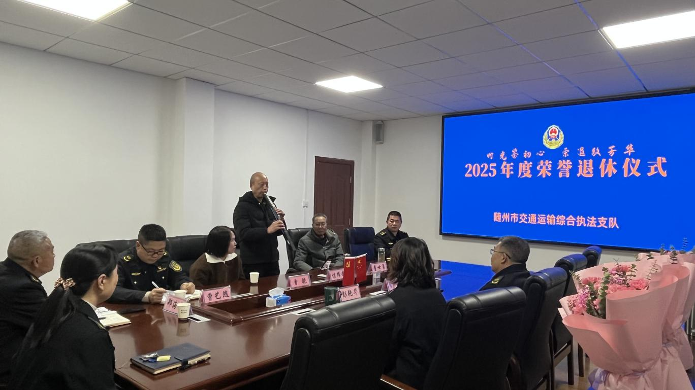 為切實(shí)增強(qiáng)退休干部職工的政治榮譽(yù)感、組織歸屬感與生活幸福感,12月29日,隨州市交通運(yùn)輸綜合執(zhí)法支隊(duì)舉行“時(shí)光鑒初心 榮退敬芳華”主題榮譽(yù)退休儀式,向三位2025年度光榮退休的干部職工致以崇高敬意與誠(chéng)摯感謝。