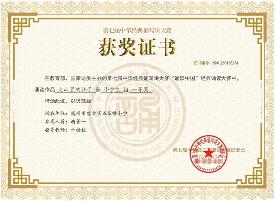 隨州新聞網(wǎng)訊 (通訊員汪玲、葉桂枝)1月13日,由教育部、國家語委主辦的第七屆中華經(jīng)典誦寫講大賽“誦讀中國”經(jīng)典誦讀大賽獲獎名單公布,曾都區(qū)五眼橋小學(xué)謝菁一同學(xué)憑借作品《大山里的孩子》,斬獲全國一等獎。