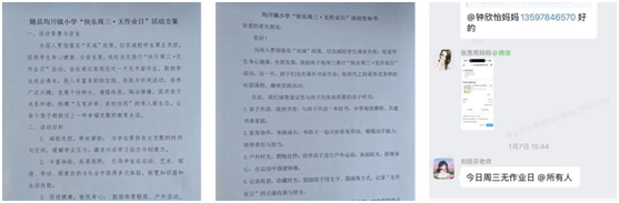 嚴格制度設計,確保“減負”落到實處。各校在教師例會上詳細解讀活動實施方案,明確執(zhí)行標準:每周三,所有學科不得布置任何書面作業(yè)、線上打卡任務,并嚴禁將作業(yè)轉(zhuǎn)移至其他日期。一、二年級繼續(xù)保持每日無課外書面作業(yè)的要求,其他年級嚴格執(zhí)行周三“零作業(yè)”規(guī)定。通過發(fā)放家長告知書、開展“親子時光”系列家;顒,學校積極引導家長理解、支持并參與“無作業(yè)日”的教育過程,推動“減負”理念向家庭與社會延伸。