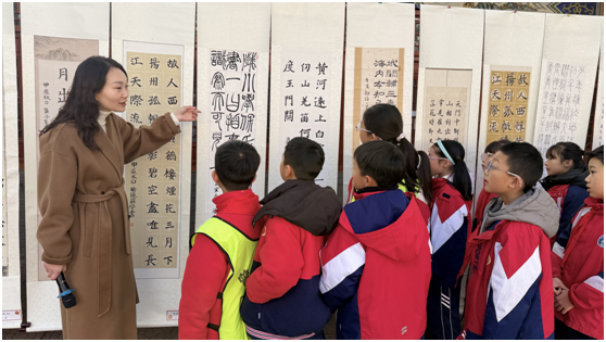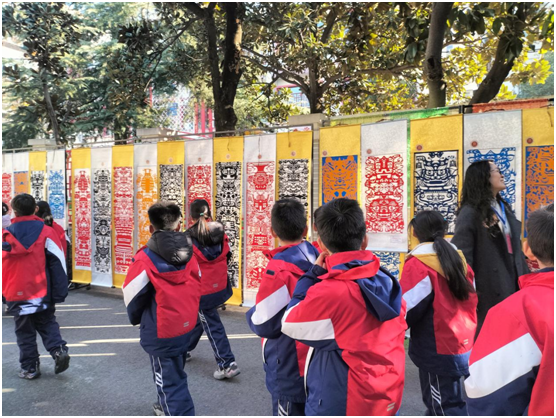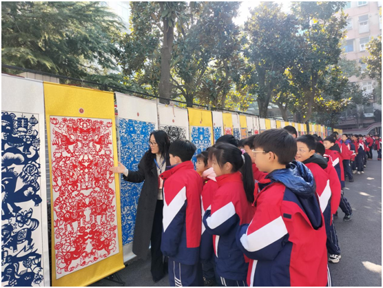 進(jìn)入展區(qū),感恩路、筑夢(mèng)路兩側(cè)集中展示學(xué)生書法與剪紙作品,現(xiàn)場(chǎng)懸掛的春聯(lián)營(yíng)造出濃厚的喜慶氛圍。學(xué)校副校長(zhǎng)劉丹、施圓圓正向師生介紹書法和剪紙作品特色及課程開展情況,引導(dǎo)學(xué)生感受傳統(tǒng)文化魅力,增強(qiáng)文化認(rèn)同。