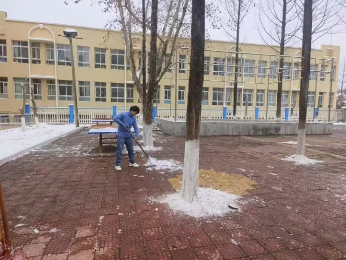 此前,低溫冰雪天氣導(dǎo)致校園內(nèi)路面結(jié)冰、部分設(shè)施受凍,給復(fù)學(xué)安全帶來挑戰(zhàn)。學(xué)校第一時(shí)間部署工作,明確分工壓實(shí)責(zé)任:由分管衛(wèi)生的負(fù)責(zé)人馬主任牽頭劃分責(zé)任區(qū)域,確保校園內(nèi)教學(xué)樓、操場(chǎng)、走廊、樓梯、校門口等關(guān)鍵區(qū)域全覆蓋,無管理盲區(qū)。下午教職工返校后,立即按照她的安排,手持鐵鍬、掃帚等工具投入除雪鏟冰工作。大家不畏嚴(yán)寒、分工協(xié)作,有的鏟除路面堅(jiān)冰,有的清掃殘留積雪,有的清理角落積雪堆積處,始終堅(jiān)持“不留死角、不留隱患”的原則,對(duì)每一處通行區(qū)域進(jìn)行徹底清理,確保學(xué)生返校路徑暢通安全。