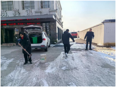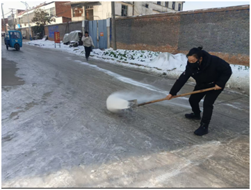 民有所呼,我有所應(yīng)。接到訴求后,社區(qū)迅速響應(yīng),第一時(shí)間組織黨員干部、網(wǎng)格員組成除冰突擊隊(duì),攜帶鐵鍬、融雪劑等工具奔赴結(jié)冰路段。隊(duì)員們分工協(xié)作,在背街小巷、拐角等易滑區(qū)域,采用“人工破冰+精準(zhǔn)撒鹽”的方式作業(yè)。他們揮動(dòng)鐵鍬敲碎堅(jiān)冰,再均勻拋灑融雪劑,防止路面二次結(jié)冰。