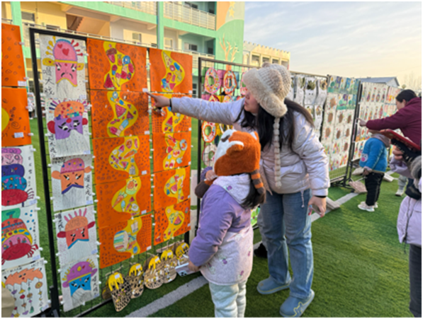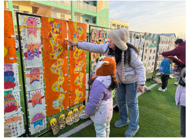 活動現場亮點紛呈,幼兒作品展示區(qū)里,繪畫、手工、泥塑、建構等作品琳瑯滿目,每一件都飽含童真創(chuàng)意。家長們駐足觀賞,認真聆聽孩子講解作品背后的故事,真切感受孩子的點滴進步。