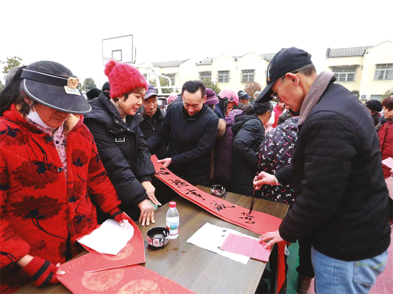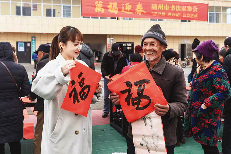 1月28日,學(xué)習(xí)貫徹黨的二十屆四中全會(huì)精神暨“炎之有理”文藝宣講活動(dòng)走進(jìn)隨縣唐縣鎮(zhèn)桃園村。本次活動(dòng)采用“理論+文藝+民俗”的融合形式,讓政策宣講更接地氣、更入人心,將黨的二十屆四中全會(huì)精神送到農(nóng)民的家門口。圖為書法家們?yōu)榇迕袼痛郝?lián)和福字。