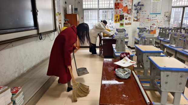 教師們分工協(xié)作,對教室、辦公室、走廊、樓道、食堂、操場、衛(wèi)生間、垃圾房等區(qū)域開展徹底清掃,全面清除衛(wèi)生死角,規(guī)范各類物品擺放。在全面清掃的基礎(chǔ)上,嚴格按照衛(wèi)生防疫標(biāo)準(zhǔn),開展專業(yè)消殺作業(yè)。對校園公共區(qū)域、教室桌椅、樓梯扶手、衛(wèi)生間等高頻接觸部位進行全覆蓋消殺,同步做好通風(fēng)換氣工作,切實阻斷病菌滋生傳播。