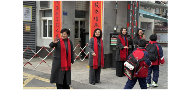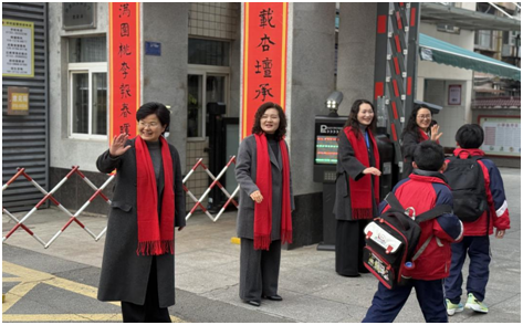 在校門口,校長、老師們與禮儀志愿者微笑相迎,用親切問候與溫暖擁抱迎接每一位學(xué)子歸來。