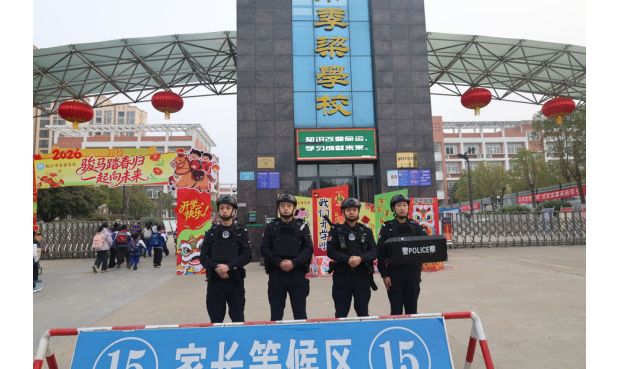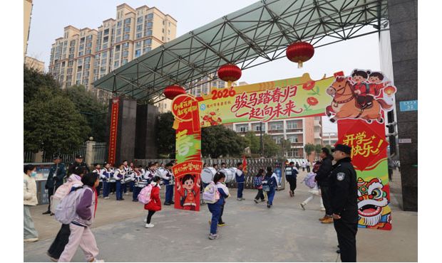 清晨,校園已煥然一新。校門口精心布置馬年迎新氛圍墻,喜慶熱烈;中心路電子屏滾動(dòng)播放迎新標(biāo)語,傳遞美好期許。為保障開學(xué)平穩(wěn)有序,公安干警、交警、社區(qū)志愿者、學(xué)校教師、干部等提前到崗,在校門口值守護(hù)航、疏導(dǎo)交通;學(xué)校安保人員全副武裝、堅(jiān)守崗位,筑牢校園安全防線。