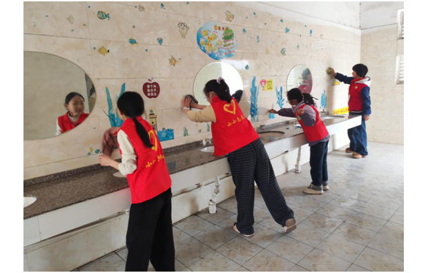 活動(dòng)中,小志愿者們分工明確、干勁十足。大家手持抹布、掃帚、垃圾袋等工具,認(rèn)真投入勞動(dòng):在校園廁所,隊(duì)員們細(xì)心擦拭墻壁、清潔宣傳畫、拖洗地面,不放過一處污漬、不留一個(gè)衛(wèi)生死角;在校園花壇,大家彎腰俯身,仔細(xì)撿拾有色垃圾,耐心清理花箱周邊雜草,讓校園綠化區(qū)域更整潔美觀。