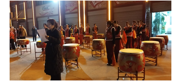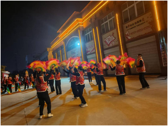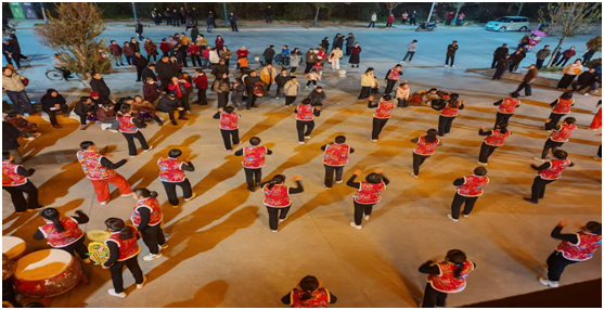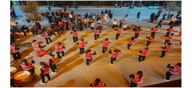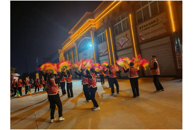 廣場舞與健身類節(jié)目則展現(xiàn)了社區(qū)女性的活力與風(fēng)采,與節(jié)目單編排高度契合!都橹袊辍贰锻鎳谩贰都t紅火火》等廣場舞曲目輪番登臺,隊員們排列成整齊的環(huán)形隊列,在夜色與燈光的映襯下翩翩起舞,彩扇翻飛間盡顯柔美,步伐鏗鏘中飽含力量。健身球表演《十送紅軍》《社會主義好》以紅色經(jīng)典為內(nèi)核,隊員們手持健身球配合旋律完成高難度動作,既展現(xiàn)了健身成果,又傳遞了紅色情懷;威風(fēng)鼓《毛主席的光輝》再次奏響鼓樂豪情,將現(xiàn)場氣氛推向新的高潮。