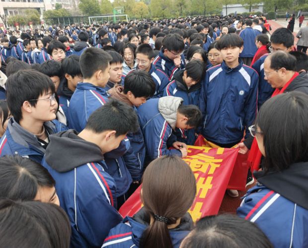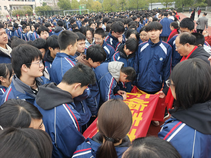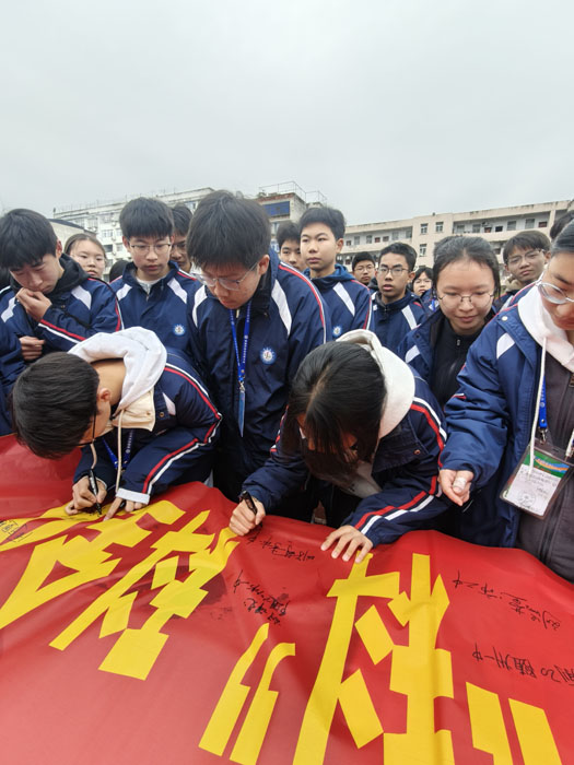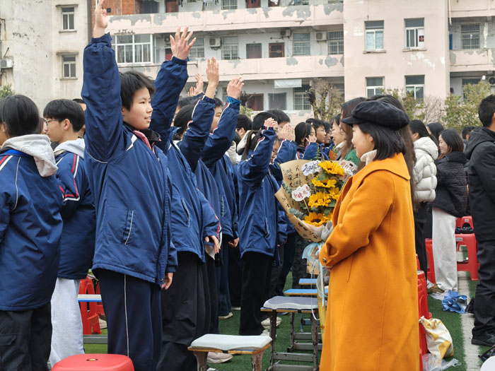 本次誓師大會環(huán)節(jié)緊湊、亮點(diǎn)突出,莊嚴(yán)與熱血交織,溫情與力量共生。在莊嚴(yán)的升旗儀式后,學(xué)校黨支部書記、校長諶述林登臺寄語,為全體學(xué)子提振士氣、領(lǐng)航賦能;十位學(xué)科組長統(tǒng)一著裝、特色送福,28位班主任集體宣誓,盡顯師者擔(dān)當(dāng)與育人初心;九年級學(xué)子高舉右拳、誓言震天,展現(xiàn)出迎難而上、勇攀高峰的青春風(fēng)采。大會還設(shè)置勵志宣講、親子師生互動、簽名明志、穿越“夢想門”“成功門”等特色環(huán)節(jié),進(jìn)一步點(diǎn)燃備考熱情,堅(jiān)定了全體師生沖刺中考、再創(chuàng)佳績的堅(jiān)定信念。